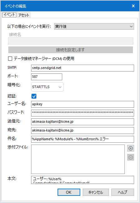 - パスワード:SendGridから入手したapiキーを記載