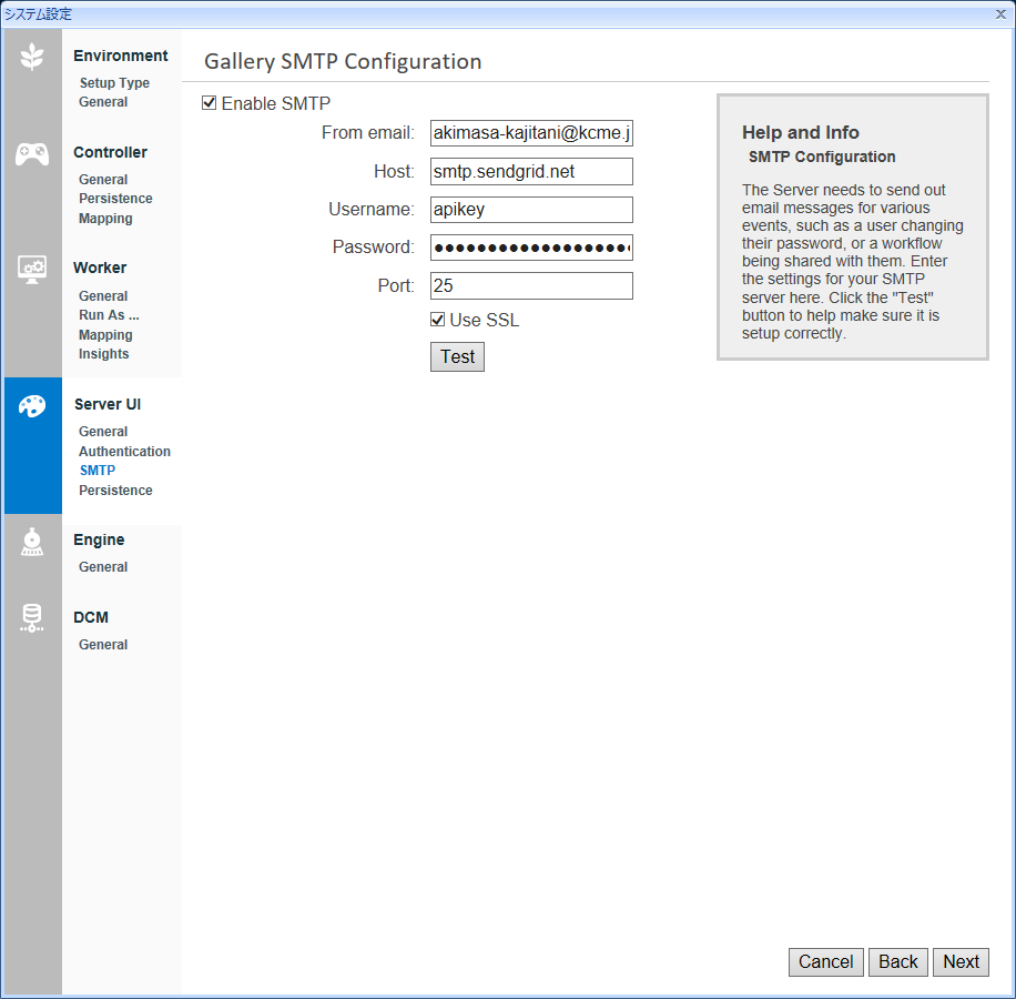 Alteryxシステム設定を起動し次へ次へ、と設定を進めていくと、「Gallery SMTP Configuration」の画面でSMTPの設定を行います。
