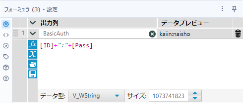 これに対して、まずフォーミュラツールでIDとPassをコロンで結合したものを作ります。