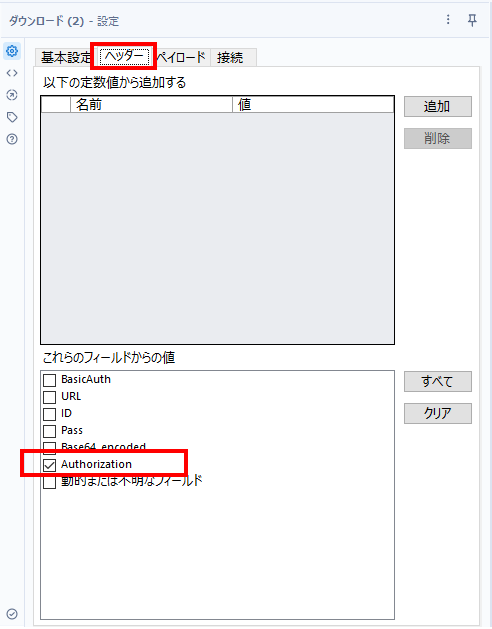 次に、Authorizationというフィールドを作成し、「Basic 」という文字に続いてBase64エンコードされた文字列を結合します。