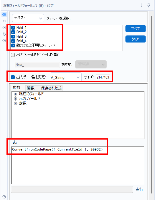 では、これを読み込んだあとに、ConvertFromCodePage関数で変換していきましょう。複数のフィールドを一気に変換する際は、複数フィールドフォーミュラツールを使います。設定としては以下のような形になります。EUC-JPは20932という番号が当てはまります(これは、マイクロソフト社のMSDNで調べることができます。こちら です)。