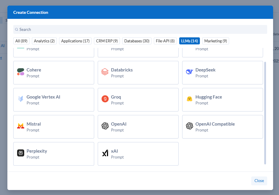 自分の好きなLLMを利用したい場合、Alteryx ONEのクラウド環境のDataのConnectionsにて事前に接続設定を作成しておく必要があります。実際に利用できる外部のLLMは以下のとおりです。