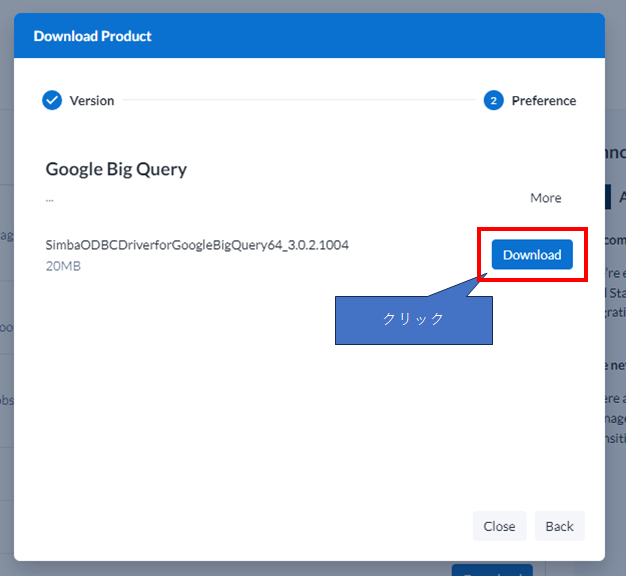 「Download」ボタンをクリックすると、以下のようにダイアログがポップアップします。ここで、Google Big Queryを選択し、Nextをクリックしてください。