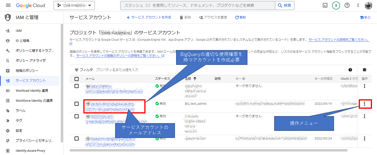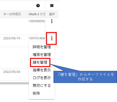 再び、「IAMと管理」の「サービスアカウント」の画面に移行してください。「操作」の3点メニューから「鍵を管理」を選択します。