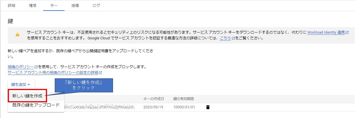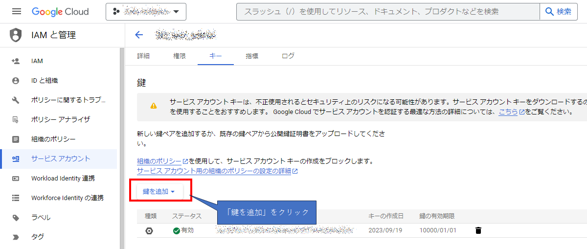 鍵(キーファイル)のダウンロードは操作パネルから「鍵を管理」をクリックしますが、その前にまずサービスアカウントを作成しましょう。