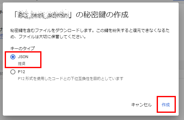 鍵の種類を選べるので、「JSON」を選択して、「作成」すると