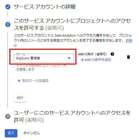 「作成して続行」します。次に、ロールを選択します。ここで選択したロールに応じて権限が設定されるので、BigQueryに対する権限を持っているロールを設定しましょう。なお、AlteryxからSQLで接続するには、「BigQuery管理者」のロールが必要になります。