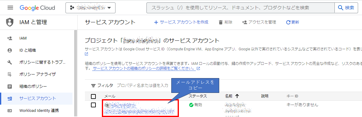 画面としては以下のような形となっています。ここで、サービスアカウントのメールアドレスと、サービスアカウントの鍵(キーファイル)の取得を行います。サービスアカウント作成後に、この画面からメールアドレスをコピーしてください。