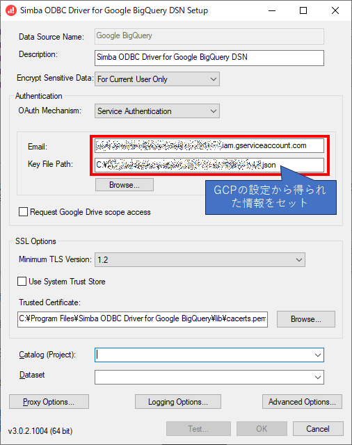 これまでで得られたメールアドレスとキーファイル(JSON)を使って、ODBCドライバを設定します。