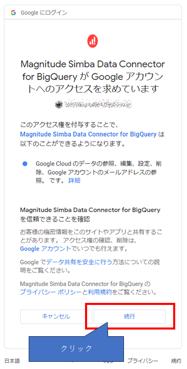 Googleへのログインが完了すると、次にアクセス権を与えてよいか確認画面が出ます。問題なければ「続行」しましょう。