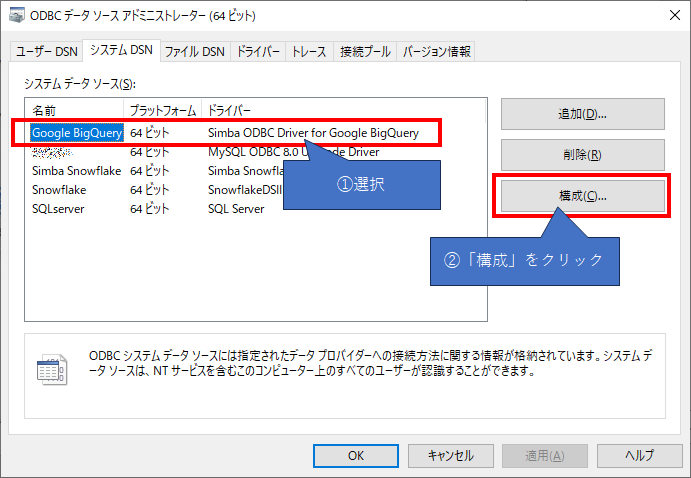 「ODBCデータソースアドミニストレーター(64ビット)」に表示されている「Google Big Query」を選択し、「構成」をクリックしてください。