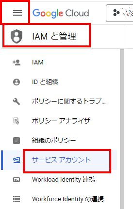 まず、GCPにアクセスしましょう。その後、「IAMと管理」の「サービスアカウント」の画面に移行してください。