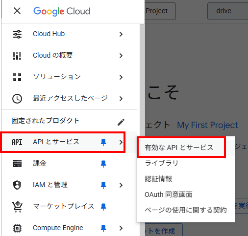 まず、Google Cloud Platformのコンソール画面 に移動し、「APIとサービス」の「有効なAPIとサービス」に移動します。