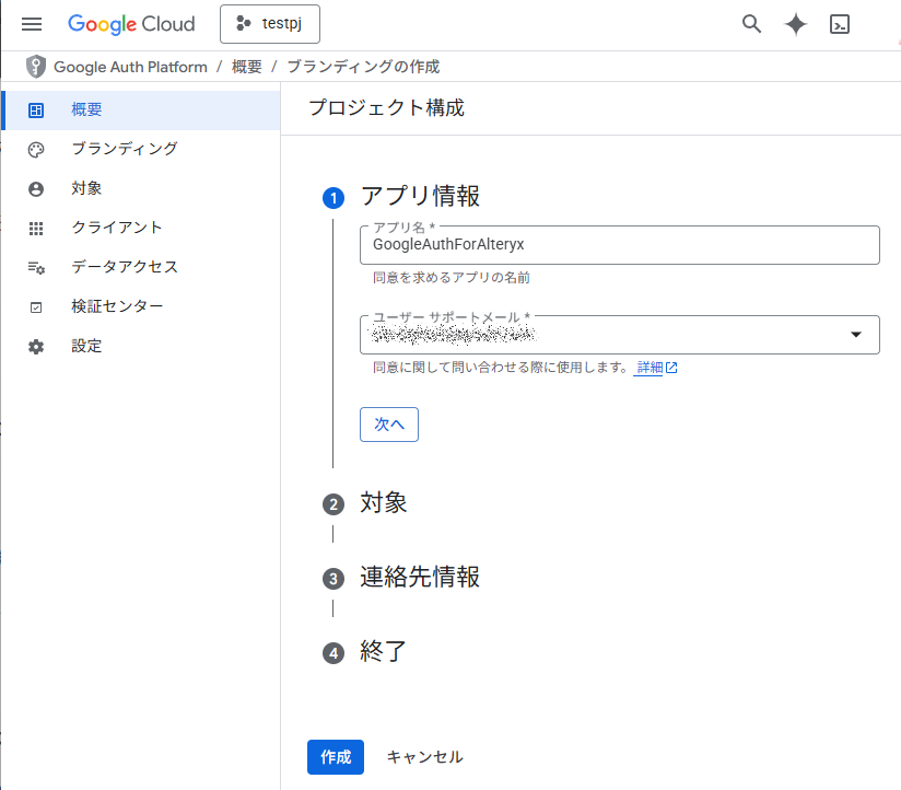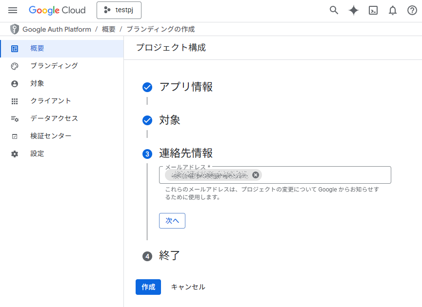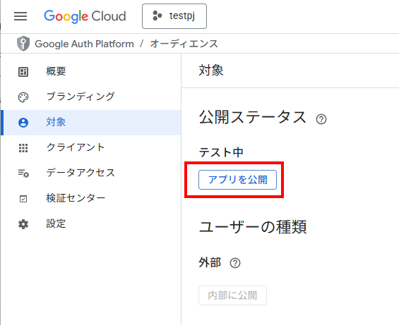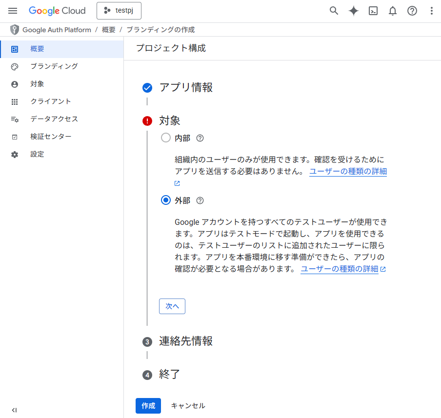 次に、対象を選択します。個人のGmailアカウントなどの場合は「外部」しか選択できません。組織のGmailの場合は「内部」も選択可能です(その場合は同じ組織内のユーザーのみの使用となります)。