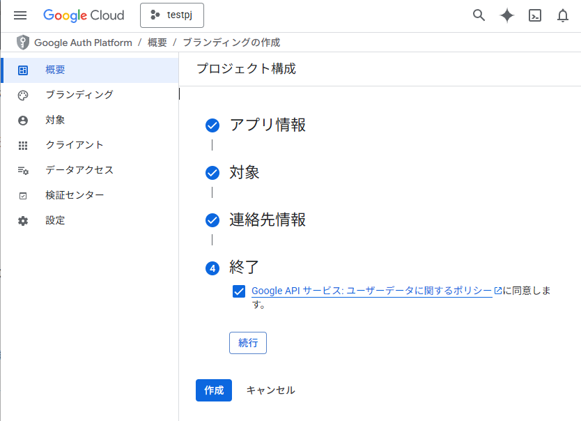ポリシーに同意にチェックを入れて作成ボタンクリックで完了です。
