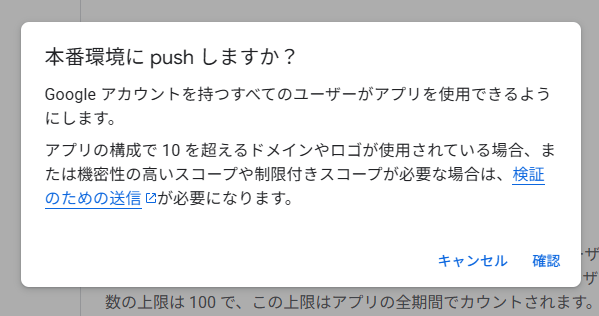 以下のように注意事項が出てきますが、「確認」をクリックします。設定によって(ロゴの使用やドメイン10以上)はGoogleにて検証する必要がありますが、デフォルト設定の場合はそのままいけます。