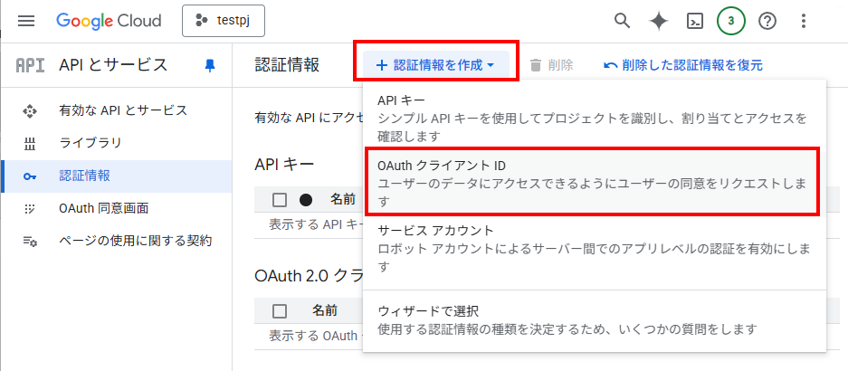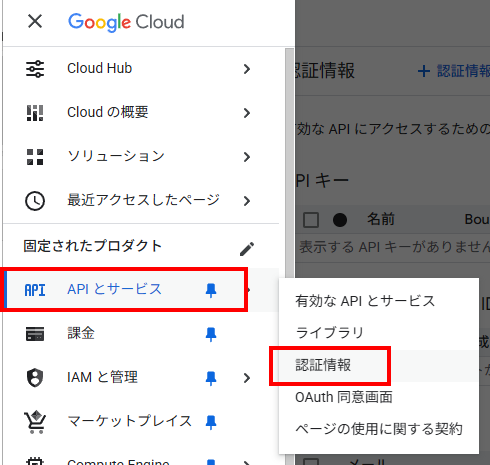 次に、OAuth2.0クライアントを作成します。様々なところから遷移可能ですが、例えばここでは「APIとサービス」の「認証情報」をクリックします。