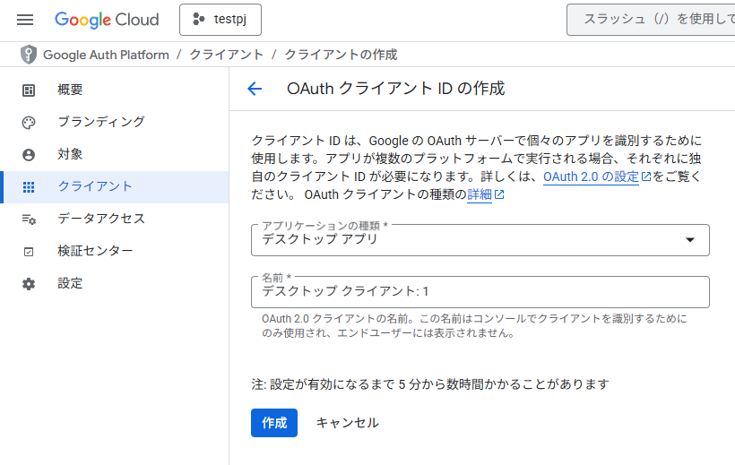 「+認証情報を作成」の「OAuthクライアントID」を選択します。