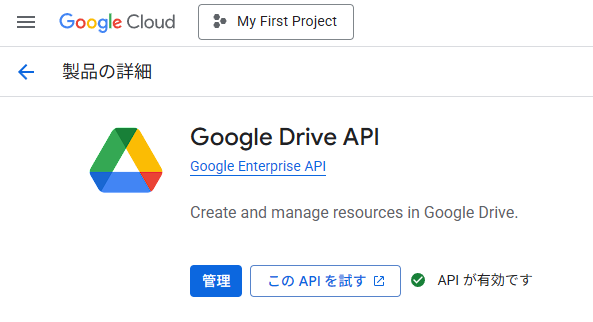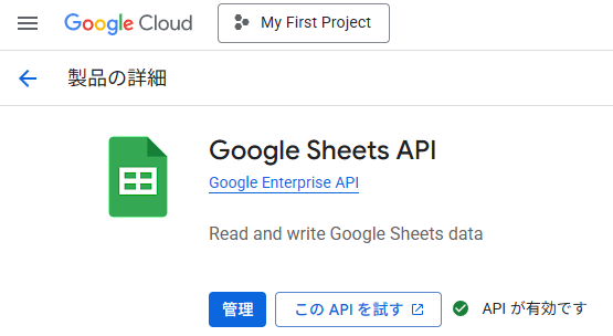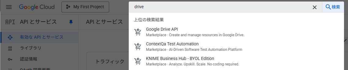 上部の検索バーで、Google Drive APIとGoogle Sheets API、をそれぞれ検索し、それぞれのAPIをオンにします。