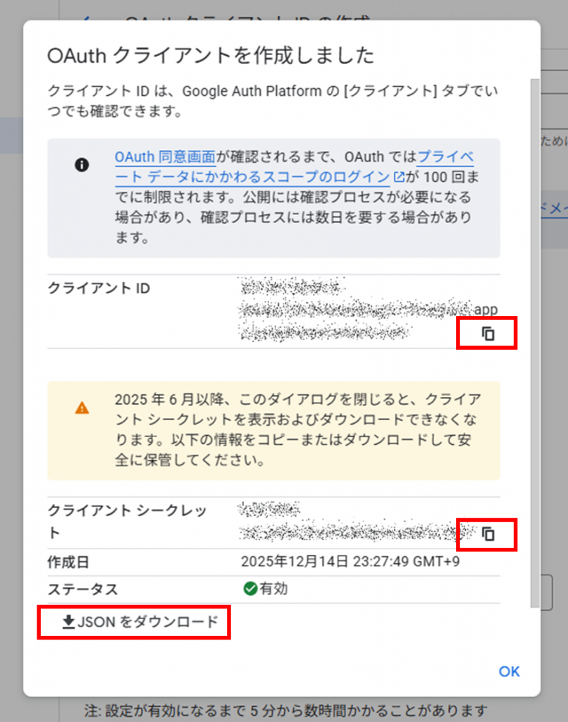このダイアログを閉じるとクライアントシークレットが表示できなくなるため、JSONをダウンロードして保管するか、クライアントIDとシークレットをコピーボタンでコピーし、厳重に保管します。誤って閉じた場合は、再度OAuthクライアントを作り直してください。