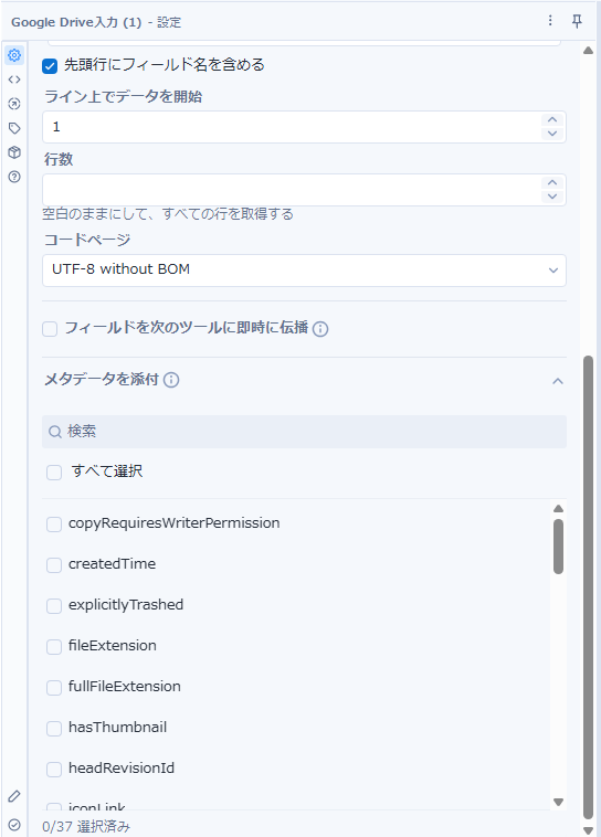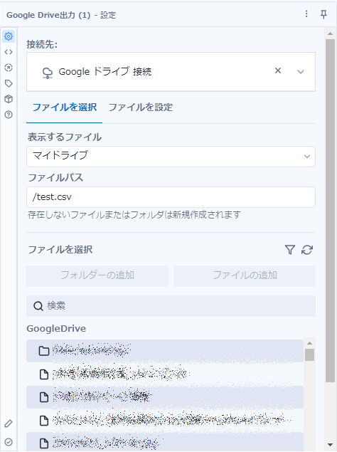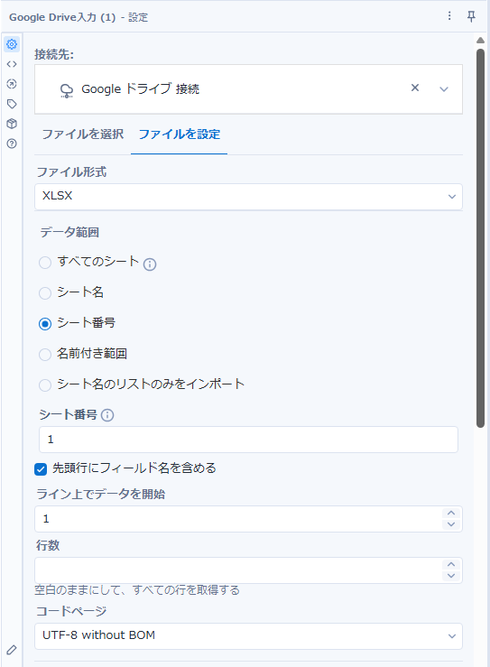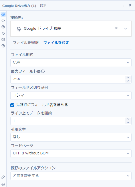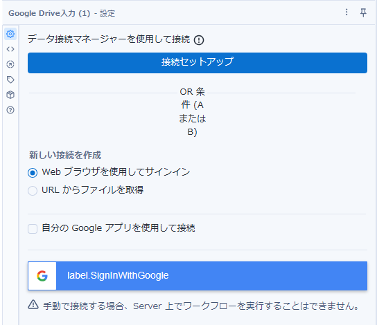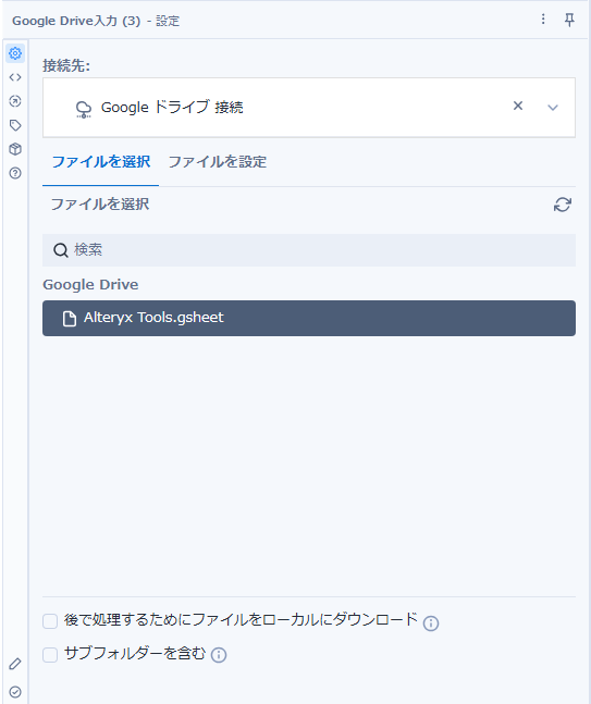 Google Drive入力ツールをドラッグ&ドロップでキャンバスに配置し、アイコンをクリックすると、以下のような設定画面が出ます。