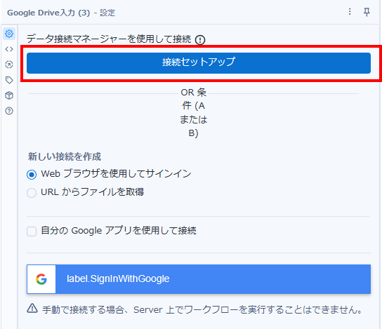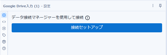 まず、Google Drive入力/出力ツールの設定画面で、「接続セットアップ」をクリックします。
