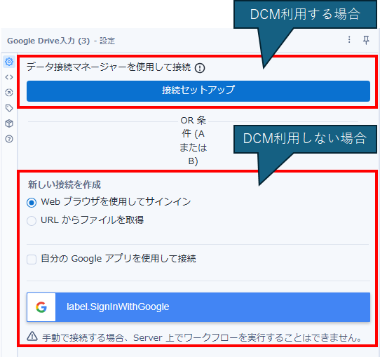 つまり、「DCMを使わない」場合の「自分のGoogleアプリを使用して接続」はCustom Appのことで、チェックを入れない場合は「Built-In App」のことを示しています。