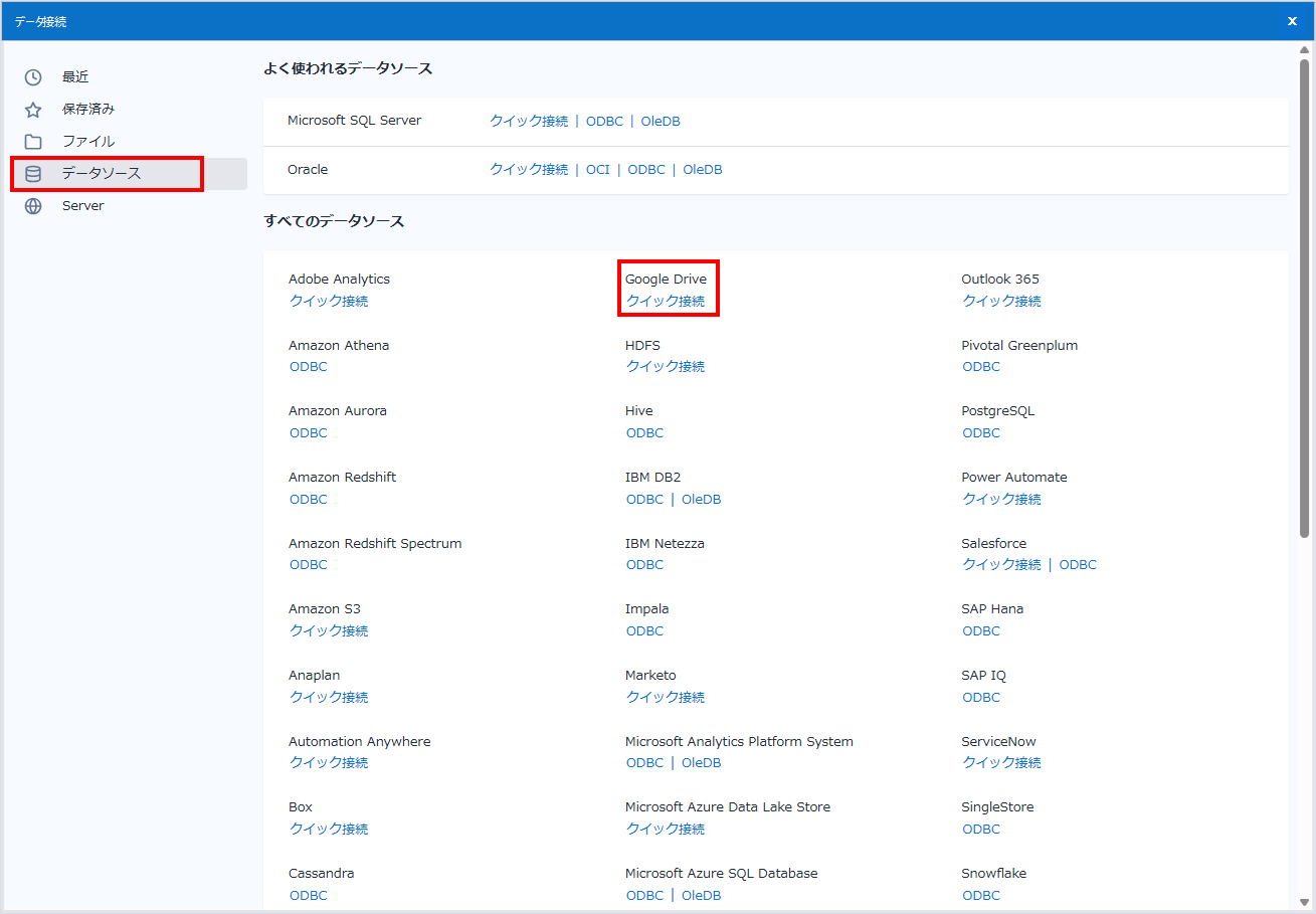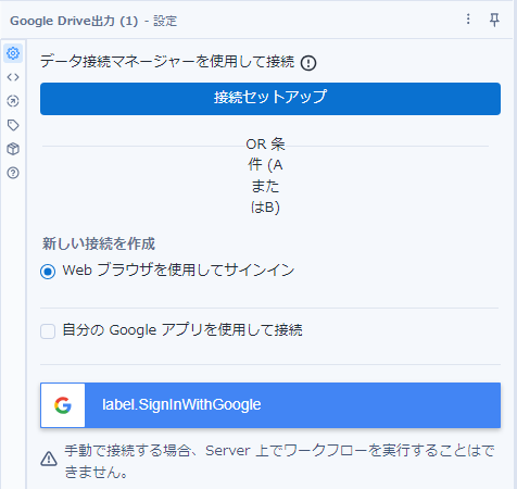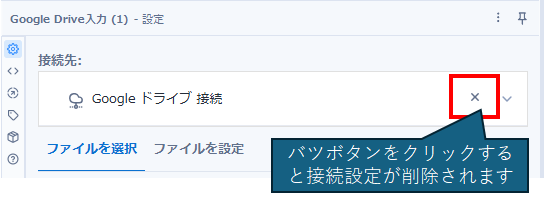 上のメニューで「Google Drive」の「クイック接続」を選択すると、データ入力/出力ツールから自動的にGoogle Drive 入力/出力ツールに変更されてしまいます。