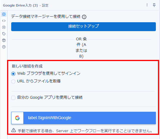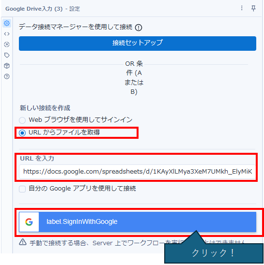 認証方式以外にも、自分で接続するファイルを選択するのか、ある特定のファイルに接続するか、という視点があります。「URLからファイルを取得」「Google Drive Shared URL」の場合は特定のファイルに接続するケースで使うオプションで、「Google Drive Input」もしくは「Webブラウザを使用してサインイン」の場合は、自分でファイルブラウズして自由にファイルを選択可能となるオプションです。