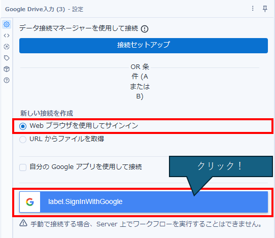 - Webブラウザを使用してサインイン+自分のGoogleアプリを使用して接続