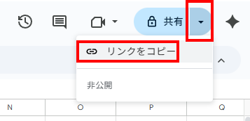 このURLはどこから入手するのでしょうか?Google Spreadsheetの右上にある共有メニューの横のボタンから「リンクをコピー」します。基本的に他のユーザーと共有するような設定をしなくてもこのリンク(URL)さえあればオッケーです。