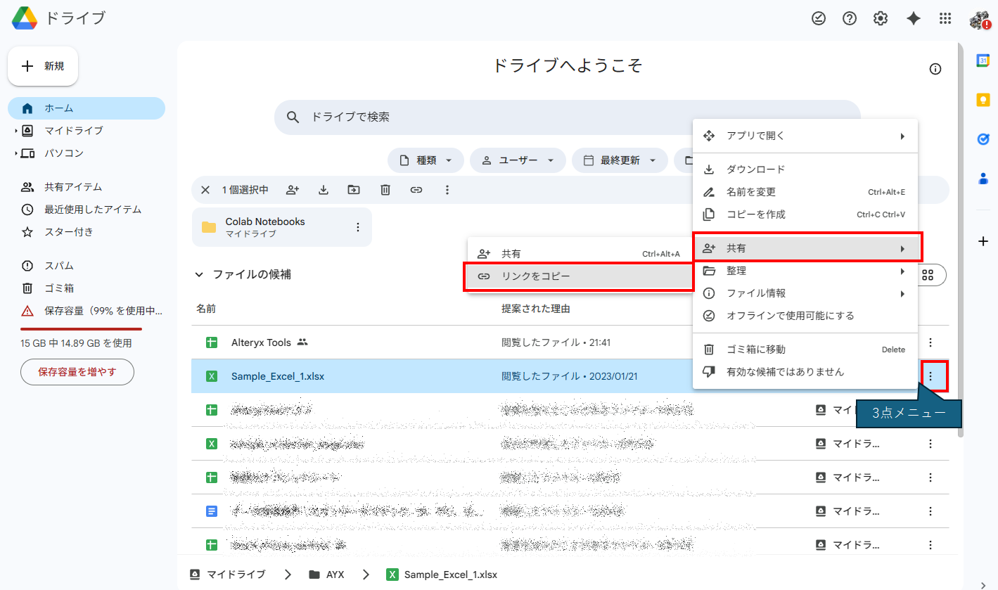 なお、以下のスクショのように、Googleドライブの各ファイルにおいて、右端の3点メニューの「共有」の「リンクをコピー」で取得したURLはうまく動きません。