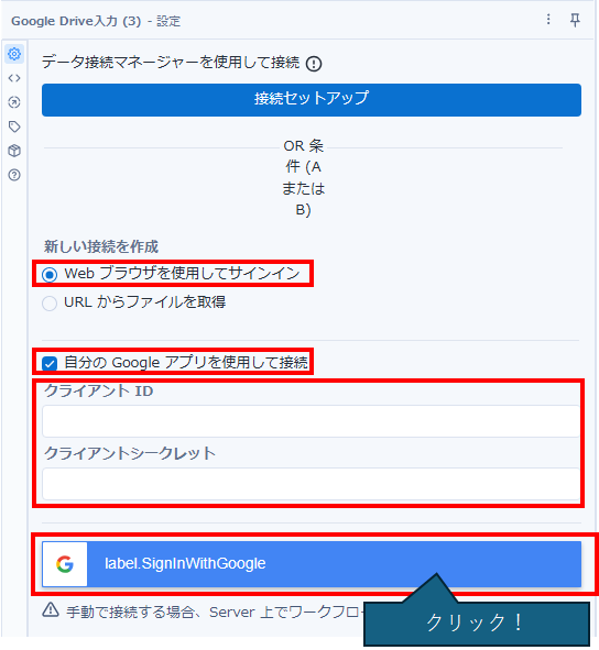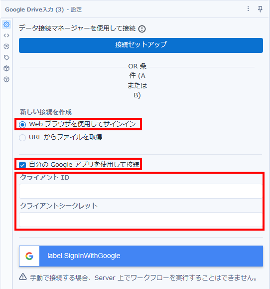 先程の「Webブラウザを使用してサインイン」の状態で、「自分のGoogleアプリを使用して接続」をクリックすると、クライアントIDとクライアントシークレットを求められます。