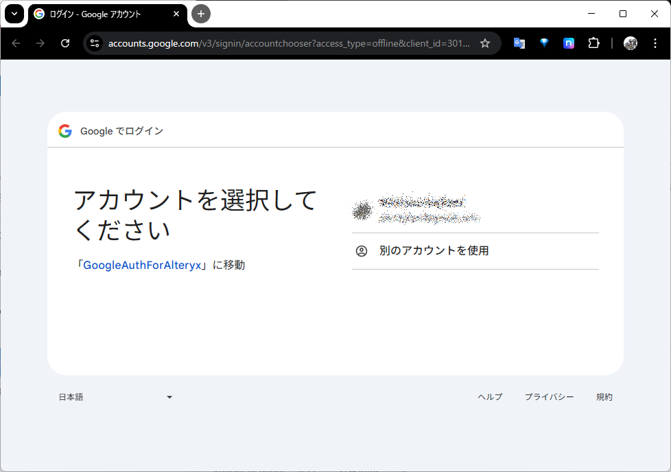 これにより、ブラウザでログイン画面に移行します。Googleにすでにログインしていれば、以下のように使用したいアカウントをクリックします。Googleにログインしていない場合は、ここでログインしてください。