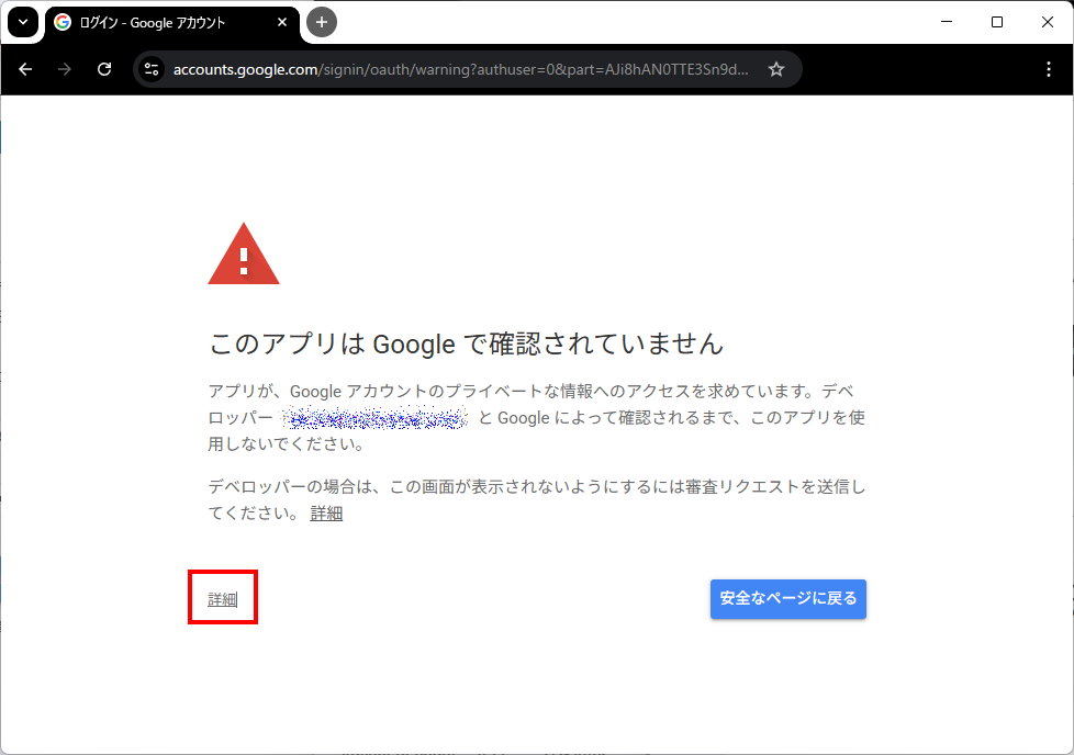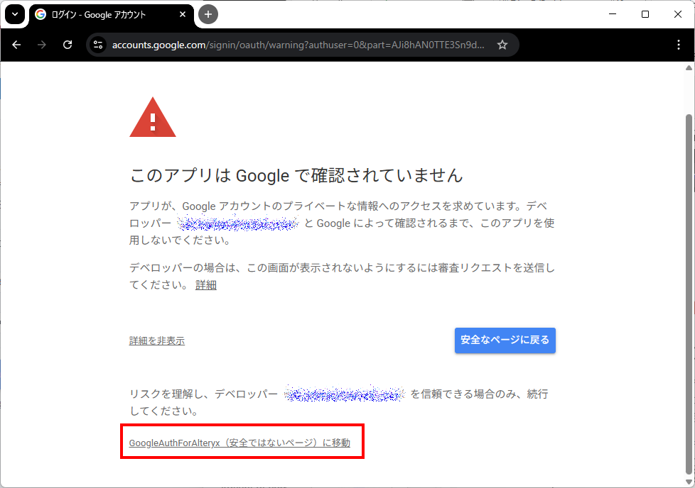 確かに、Googleにこの認証のアプリを確認してもらう方法もありますが、行う必要はありません。左下にある「詳細」をクリックし、ブラウザの画面を下にスクロールしていくと、「安全ではないページに移動」というリンクがあります。