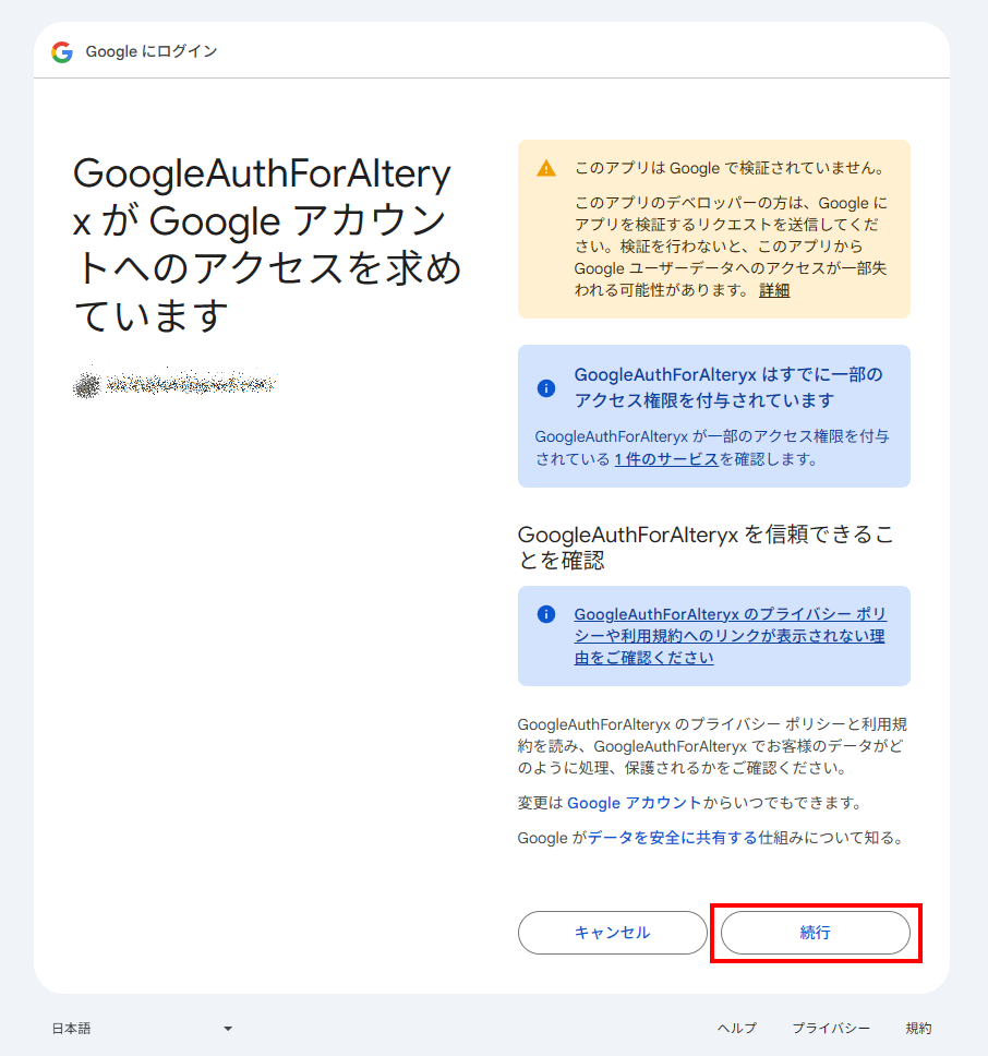「Built-In App」を使った場合は、特定のGoogleアカウントに紐づくため、設定した人が退職などした場合にアカウントが無効になるとやり直しになります。また、「Built-In App」はAlteryx社がGoogleに登録したアプリとなるため、大量のAlteryxユーザーが一度に大量に使うとAPIのレート制限が発生する可能性があります。