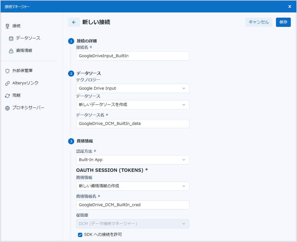 データソースにデフォルトの「Google Drive Input」を選択し、認証方式に「Built-In App」を選択しますが、その他は名前をわかりやすいものをつけ、「SDKへの接続を許可」にチェックを入れればオッケーです。