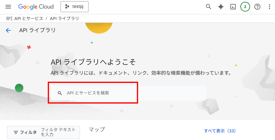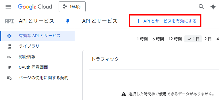 ここで検索バーが出てこない場合は、APIをオンにしたことがないはずですので、「+APIとサービスを有効にする」からそれぞれのAPIを有効にします。