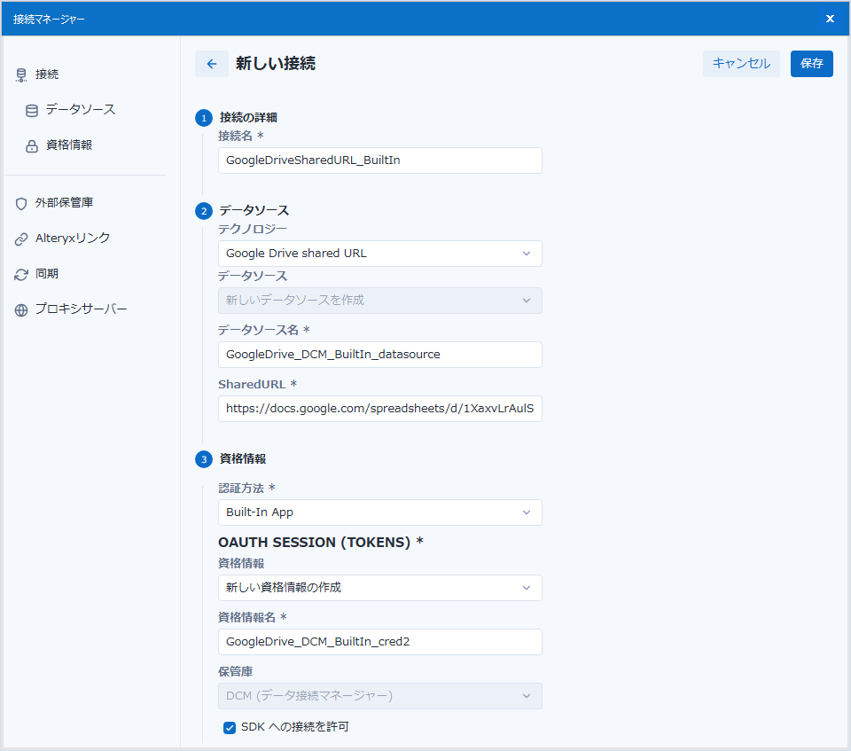データソースに「Google Drive shared URL」を選択し、「ShareURL」に、Google Driveから取得したファイルのURLを入力します(URLの入手先は、これまでの説明で行った「URLからファイルを取得」をご確認ください)。また、認証方式に「Built-In App」を選択しますが、その他は名前をわかりやすいものをつけ、「SDKへの接続を許可」にチェックを入れればオッケーです。