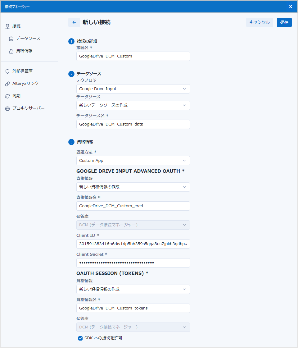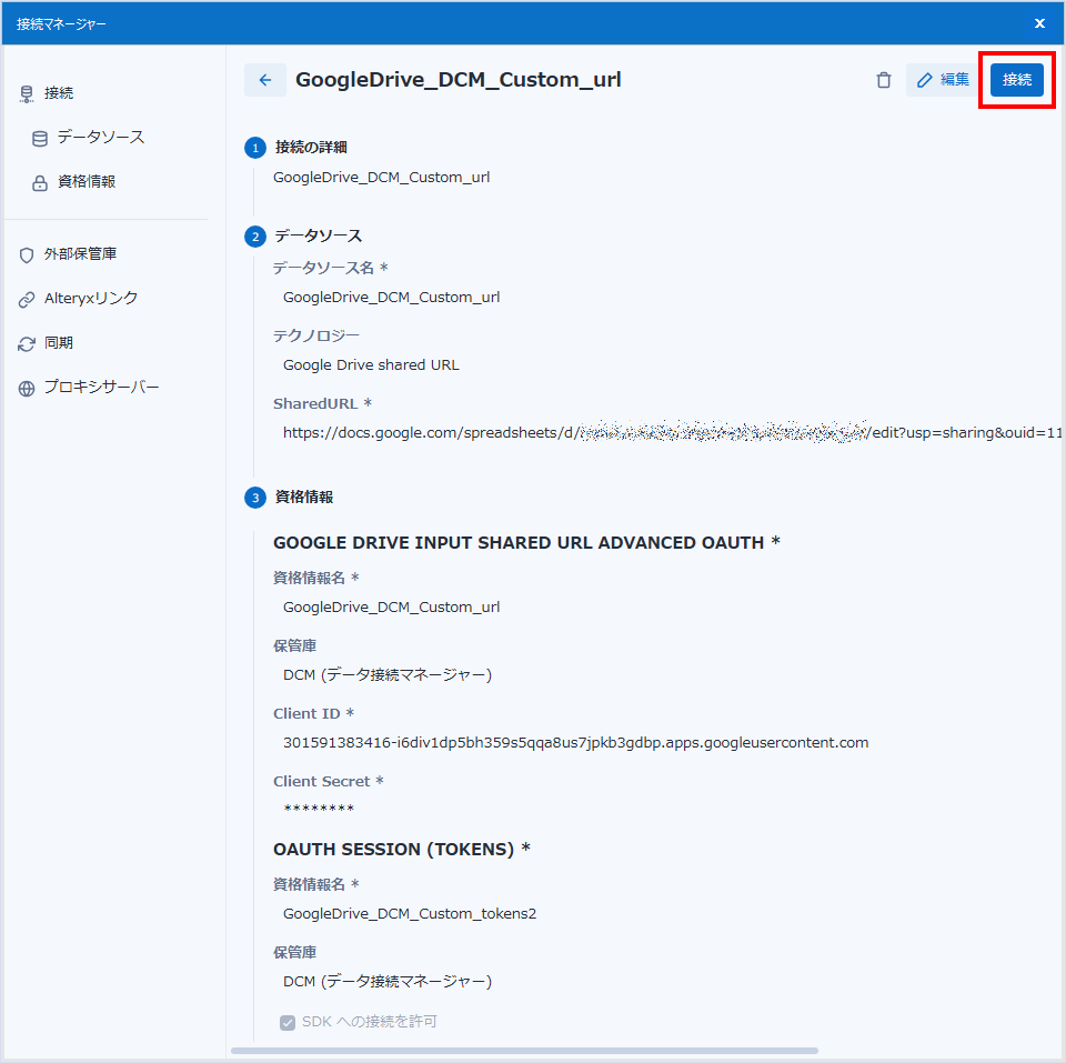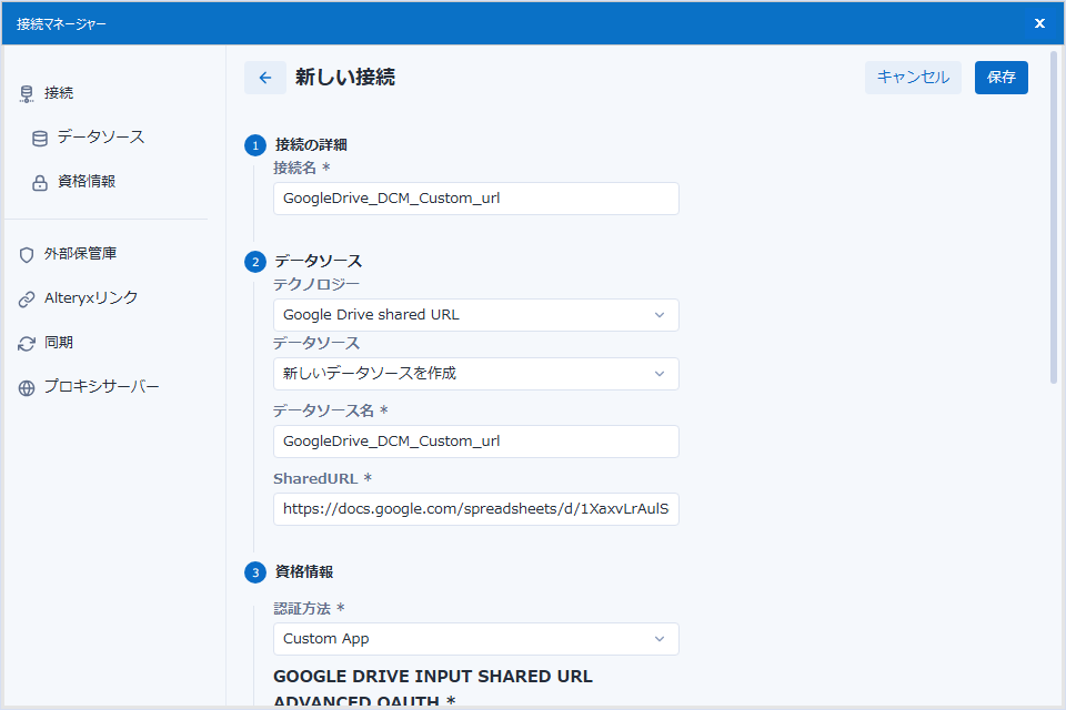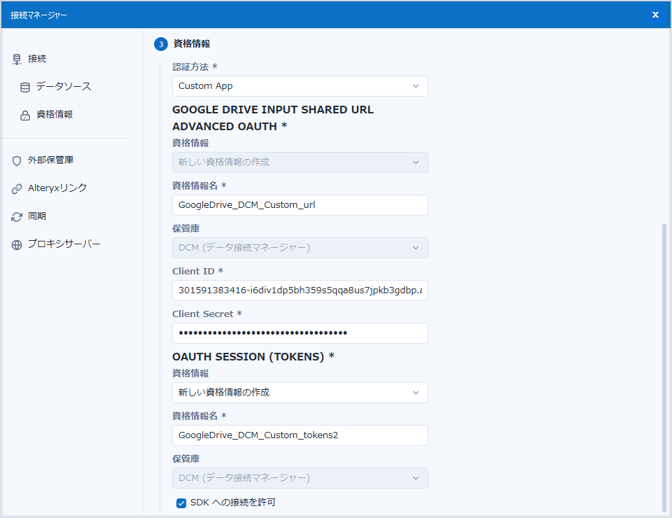 データソースに「Google Drive shared URL」を選択し、「ShareURL」に、Google Driveから取得したファイルのURLを入力します(URLの入手先は、これまでの説明で行った「URLからファイルを取得」をご確認ください)。また、認証方式に「Custom App」を選択し、ClientID、ClientSecretに事前準備で取得したクライアントID、クライアントシークレットを設定しますが、その他は名前をわかりやすいものをつけ、「SDKへの接続を許可」にチェックを入れればオッケーです。