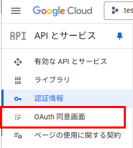 次に、「APIとサービス」内の「OAuth同意画面」をクリックします。