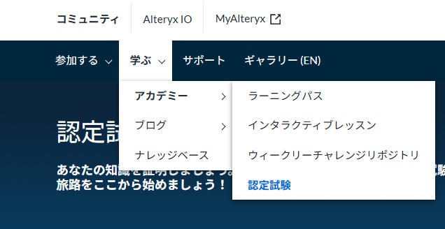 Alteryxコミュニティの[学ぶ]-[アカデミー]-[認定]のメニューから試験について確認することができます。