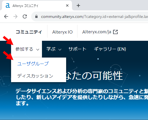 コミュニティ のトップページは以下のようになっています。ユーザーグループのページにアクセスするためには、メニューの「参加する」から「ユーザーグループ」を選びましょう。