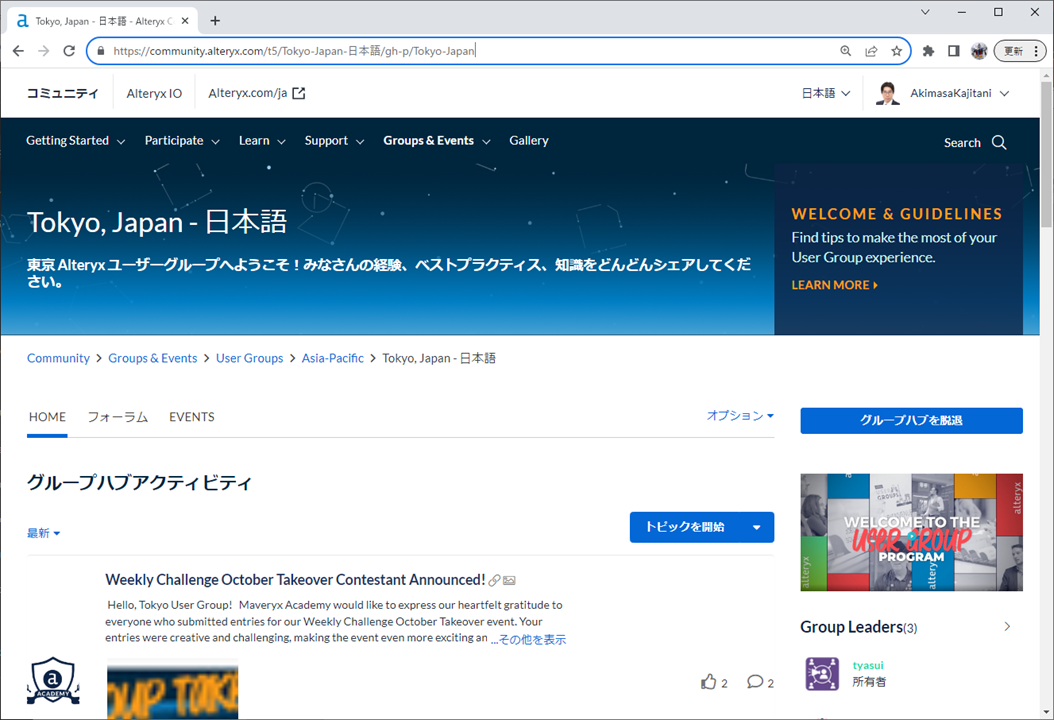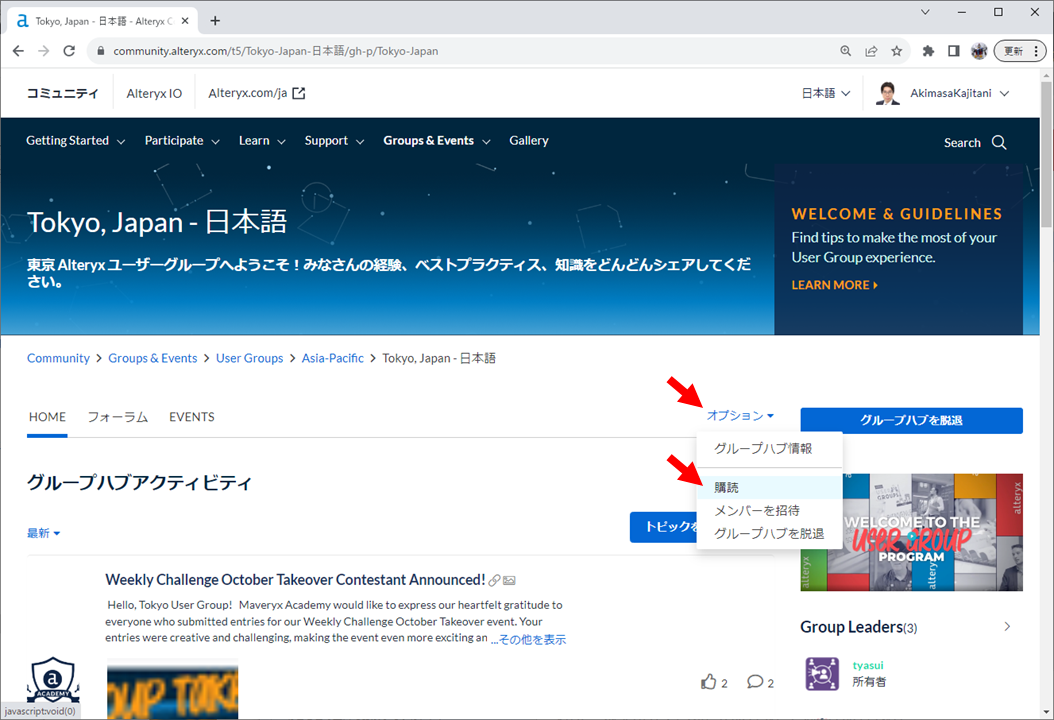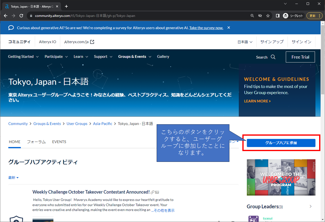 先程のユーザーグループのトップページにある、「グループハブに参加」ボタンをクリックしてください(Alteryx Communityへのログインを行っておく必要があります)。