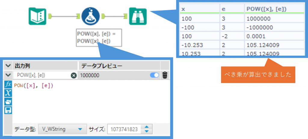下の例の 1レコード目では、100の3乗の1000000が算出されています。2レコード目では、-100の3乗の-1000000が算出されています。