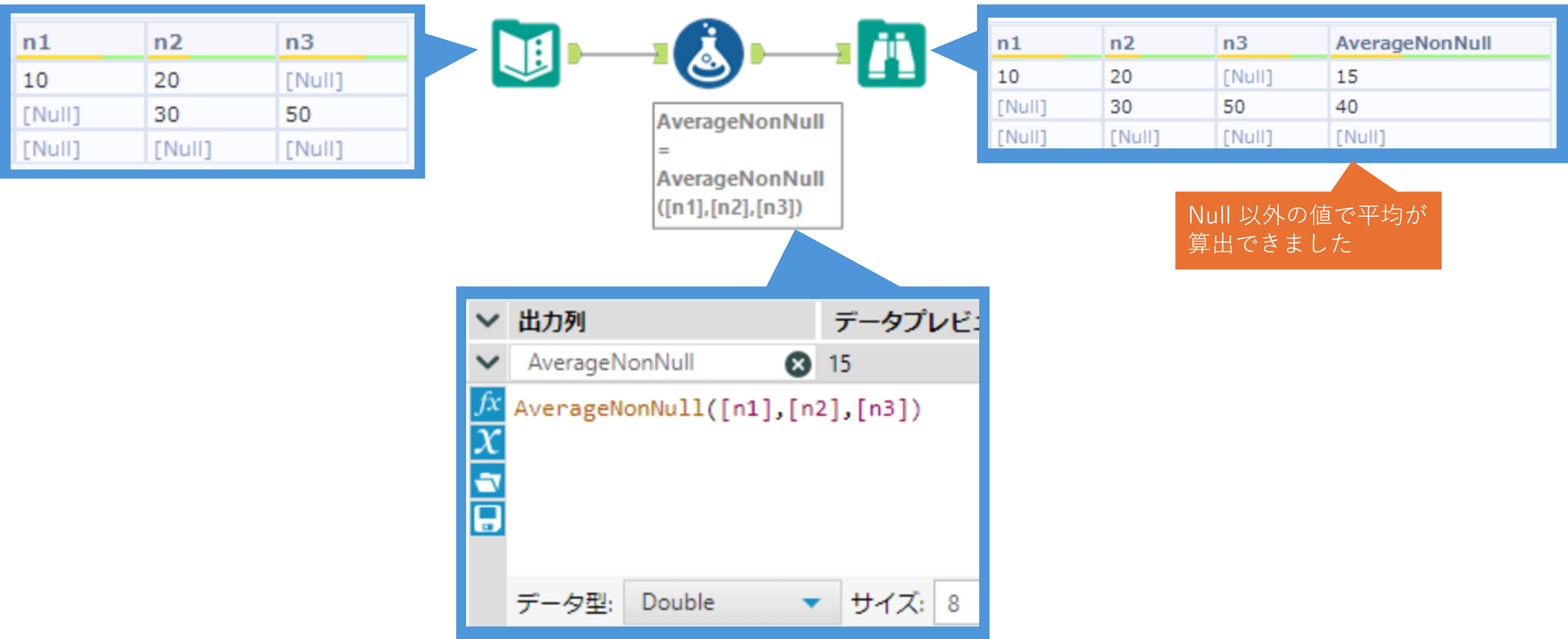 | Null でない値の平均を取得 | AverageNonNull(n1, ...) | Null を除外した複数値の平均を取得します | AVERAGEIF / AVERAGE(※Null除外相当) |