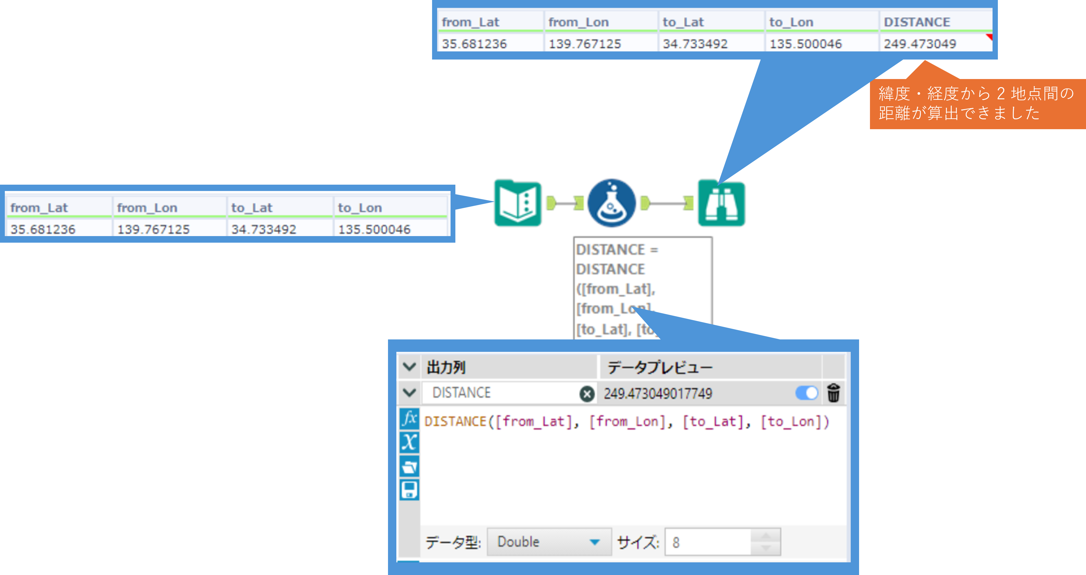 | 2地点間の距離を取得 | DISTANCE(from_Lat,from_Lon, to_Lat, to_Lon) | 緯度・経度に基づき 2 地点間の距離を算出します | - |