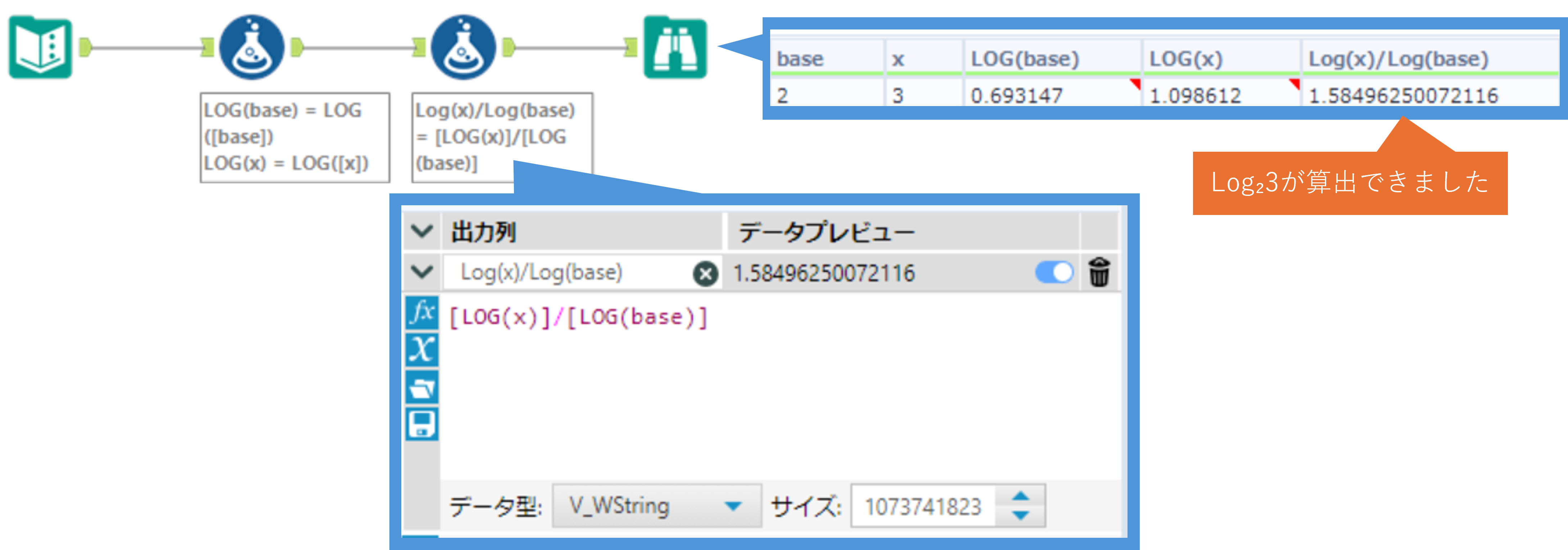次に、Log2 / Log3 を求めると、Log₂3 が算出できます。