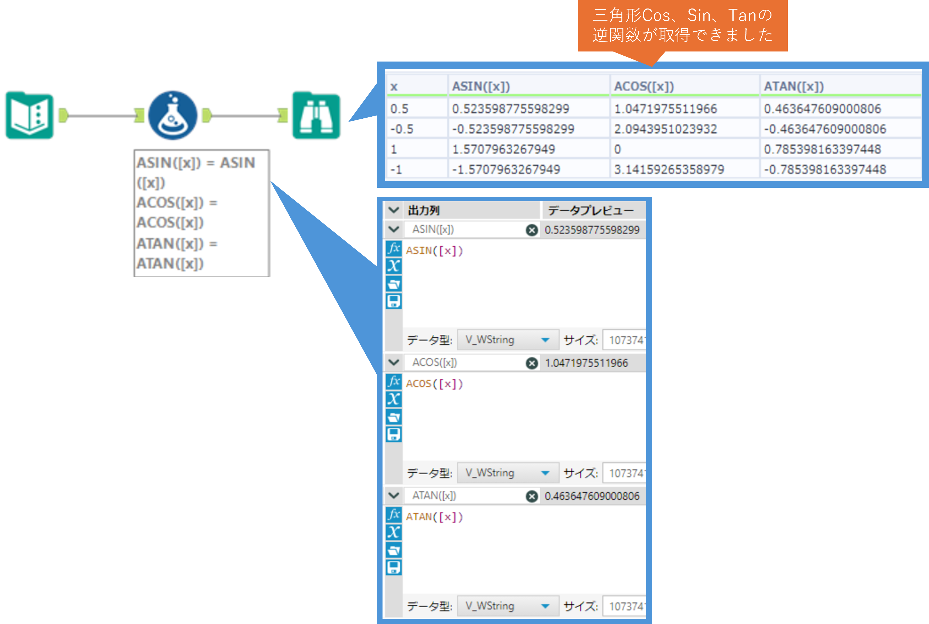 ASIN / ACOS / ATAN ・・・ 三角関数の逆関数の値を取得します