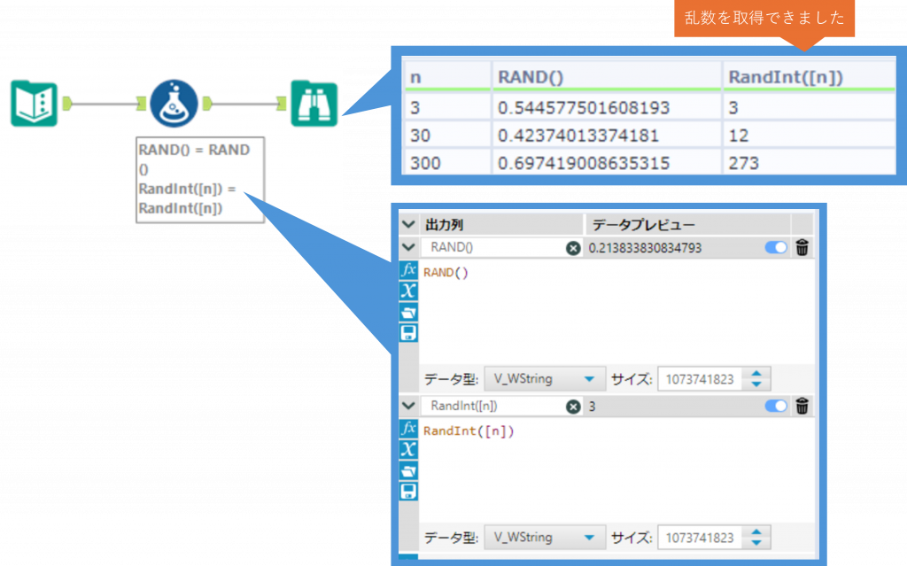 RandInt(n) は0以上 n 未満の乱数を取得します(整数)。ワークフローを実行するたびに、異なる値が返ってきます。
